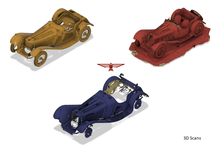 Using the 3D scanner we laser scanned a series of original SS100 cars, as well as replicas built by others. These cars came from South Australia, Victoria, and New South Wales. In our Design Office, the various scans were superimposed which affored us the opportunity to compare the bodies and identify mean and outlier dimensions.
