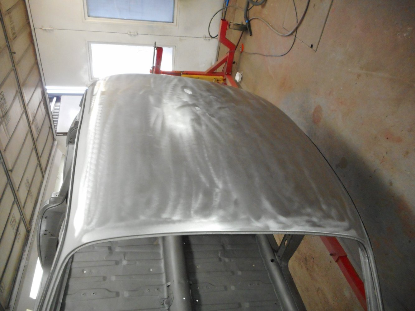 In as short a time as possible after the bare metal has been exposed through paint, schutz and filler being removed, the bodyshell's bare metal is coated with a two-pack epoxy primer to prevent flash rusting.
